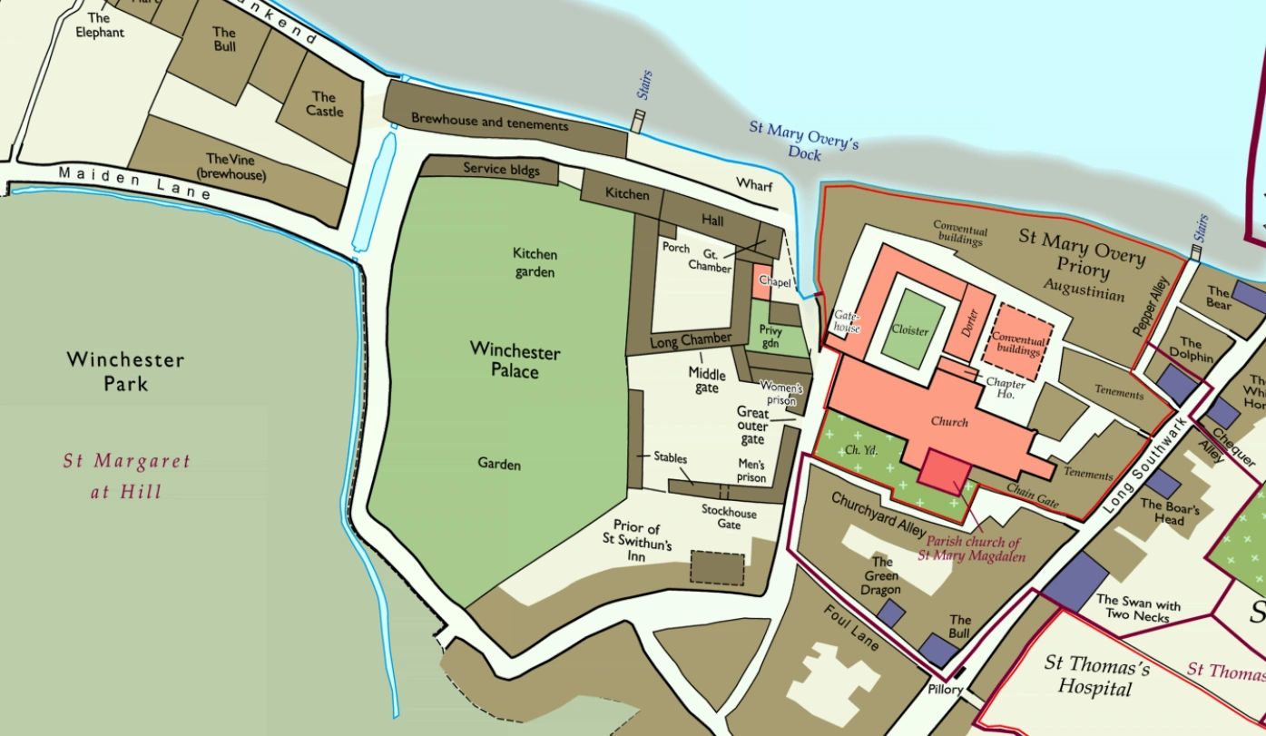 Winchester Palace was built on the south bank of the Thames, just west of Southwark Cathedral, so that the Bishop of Winchester had a comfy base when he came to London. An early incumbent was Henry of Blois, the brother of King Stephen, who held the bishopric for over 40 years in the 12th century. A magnificentpalace grew up around the original Great Hall, with subsequent clerics adding bedrooms, wine cellars, a brew-house, butchery, tennis court, bowling alley and pleasure gardens. A famous illustration from 1647 shows a chimneyed complex with two courtyards. The bishop also oversaw the Liberty of the Clink, an independent neighbourhood with its own brothels, theatres and infamous prison.