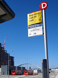 Eventually, after not stopping at a number of 'not in use' bus stops, the 339 pulled in alongside the bus station at Stratford City. Not in the bus station, like it used to, but at a separate bus stop over the road. The D8 stops here too, so if you want to catch a bus from Westfield towards Bow (and beyond) you now have to cross the dual carriageway to new bus stop X. Four problems. One, bus stop X doesn't have any numbered plates announcing that the 339 and D8 stop here. Two, bus stop X doesn't yet have any timetables for either of these services. Three, bus stop X has no bus shelter, so when it rains all the Westfield shoppers departing by 339 or D8 are going to get very wet. And four, the original bus stop W on the other side of the road still says the 339 and D8 start there, except they don't. There is a bright yellow notice on stop W detailing the changes, but those who don't spot it will have no chance of dashing across the road in time once they realise their mistake. I'm sure someone'll get round to changing the signage soon, if they haven't already. But it's a stuttering start for these three extended bus services, until the wrinkles are ironed out.