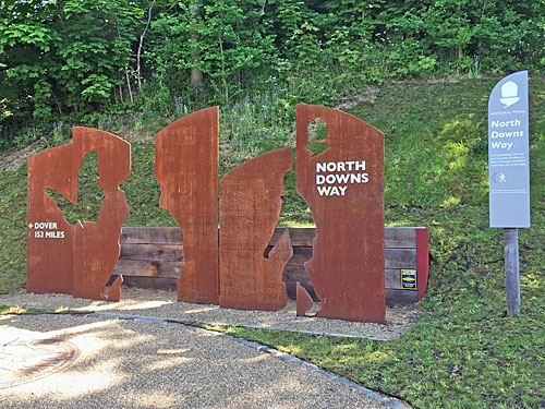 The North Downs Way begins at a most unprepossessing location, specifically a junction on the busy A31 dual carriageway. I'd missed its significance on the walk from the station, but a recently-installedsculptural sign (facing the other way) makes a much more impressive backdrop for your kick-off selfie. I did not take a kick-off selfie. Initially it seems like a slog of road walking lies ahead, but the path soon diverts off into the trees and I didn't see the A31 again, only heard it. The first mile follows the River Wey (North Branch), skirting meadows and climbing the leafy banks. Oddity 1: HELP YOURSELF TO A COPY OF MY BOOK, it said on a mysterious scrawled sign beside a white box. And presumably people had, because the box was empty. Oddity 2: A carved wooden bench in the shape of something which at first looked potentially rude, but was thankfully an orchid.
