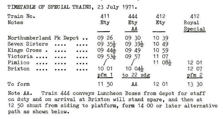 Who opened the extension? Not the Queen because she'd officially opened the line down to Victoria. Instead Princess Alexandra got the job and turned up at Brixton at 11.15am in a jaunty hat. She performed the official ceremony at the foot of the main stairs, then pressed a button to start the escalators, then inspected the ticket office, then glided serenely downwards for a further ceremony in the driver's cab... where she pressed another button to start the first journey north. This terminated at Pimlico where further presentations took place, and then the royal party stepped into the rear carriage of a second train which took them back to Brixton. Here the princess inspected the station operations room, unveiled a commemorative plaque and headed off for lunch at Lambeth Town Hall. London Transport staff were instead treated to luncheon boxes delivered from the depot aboard an empty train. The extension was opened to public service at 3pm. (contemporary typewritten report)