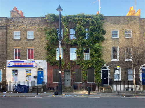 We cross the A11, better known as Whitechapel Road, which is the second major trunk road in quick succession. By following Vallance Road we skip the market and dive back into a world of minor mini-markets, one of which the owner has had the nerve to call Low Cost Shop. Before long there isn't a pre-war building in sight... other than the former Earl Grey pub whose blue plaque tells us that Mary Hughes Friend Of All In Need once lived here. In 1926 she turned the building into a homeless refuge and renamed it the Dewdrop Inn, living here in voluntary poverty until she was knocked over by a tram, and hers is quite the biography.