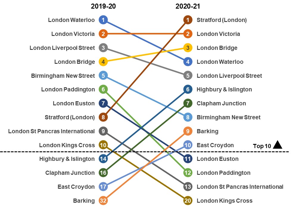 Towns a long way from National Rail stations The nearest town to London that's more than 5 miles from a station:Ongar, Essex The nearest town to London that's more than 10 miles from a station:Haverhill, Suffolk The nearest town to London that's more than 15 miles from a station:Fakenham, Norfolk The nearest town to London that's more than 20 miles from a station:Minehead*, Somerset