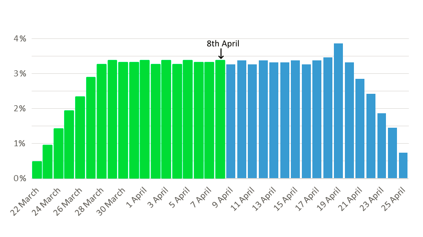 The three weeks in the middle (that's 28th March to 18th April) have very similar frequencies.