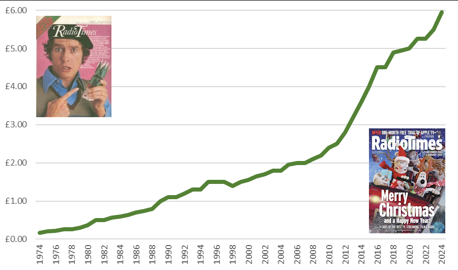 The data: 1974 16p, 1975 20p, 1976 22p, 1977 26p, 1978 26p, 1979 30p, 1980 36p, 1981 50p, 1982 50p, 1983 56p, 1984 60p, 1985 64p, 1986 70p, 1987 74p, 1988 80p, 1989 £1.00, 1990 £1.10, 1991 £1.10, 1992 £1.20, 1993 £1.30, 1994 £1.30, 1995 £1.50, 1996 £1.50, 1997 £1.50, 1998 £1.40, 1999 £1.50, 2000 £1.55, 2001 £1.65, 2002 £1.70, 2003 £1.80, 2004 £1.80, 2005 £1.95, 2006 £1.99, 2007 £2.00, 2008 £2.10, 2009 £2.20, 2010 £2.40, 2011 £2.50, 2012 £2.80, 2013 £3.20, 2014 £3.60, 2015 £4.00, 2016 £4.50, 2017 £4.50, 2018 £4.90, 2019 £4.95, 2020 £5.00, 2021 £5.25, 2022 £5.25, 2023 £5.50, 2024 £5.95