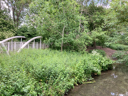 The Environment Agency remodelled the river hereabouts in 2008, removing six austere weirs and replacing a harsh concrete channel with soft-edge meanders. Look down from the cycle path and you'll now see low gravel riffles and occasional log deflectors, all supposedly improving flow diversity and bed scour although it's hard to tell at current river levels. Any fish hereabouts would be far better sticking to the deeper, broader Hogsmill, into whose waters the Bonesgate Stream merges beyond a final white footbridge.