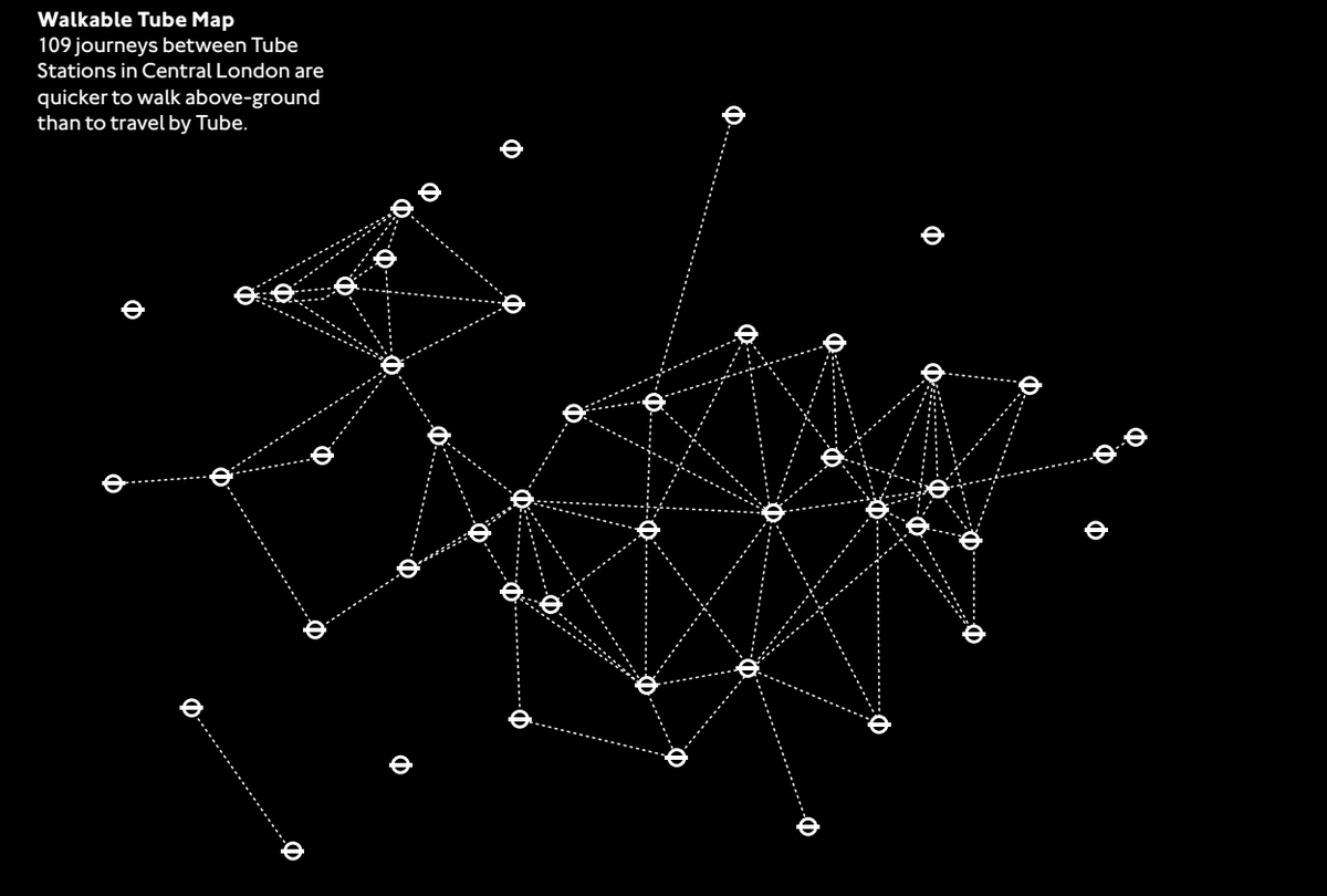 There have been multiple attempts to do this kind of thing before. A group of students produced a Shortwalk map in 2007 and an insurance company made another in 2009. Also in 2007 the Legible London yellow book contained a Walkable tube map of 109 journeys quicker by foot than Tube. But it wasn't until 2015 that TfL made an official map of walking times between stations and properly promoted it, also a full list of journeys that could be quicker to walk. The following year they multiplied all the times by 100 to show steps rather than minutes and pretended it was a new map. And now here we are with a proper map-based iteration.