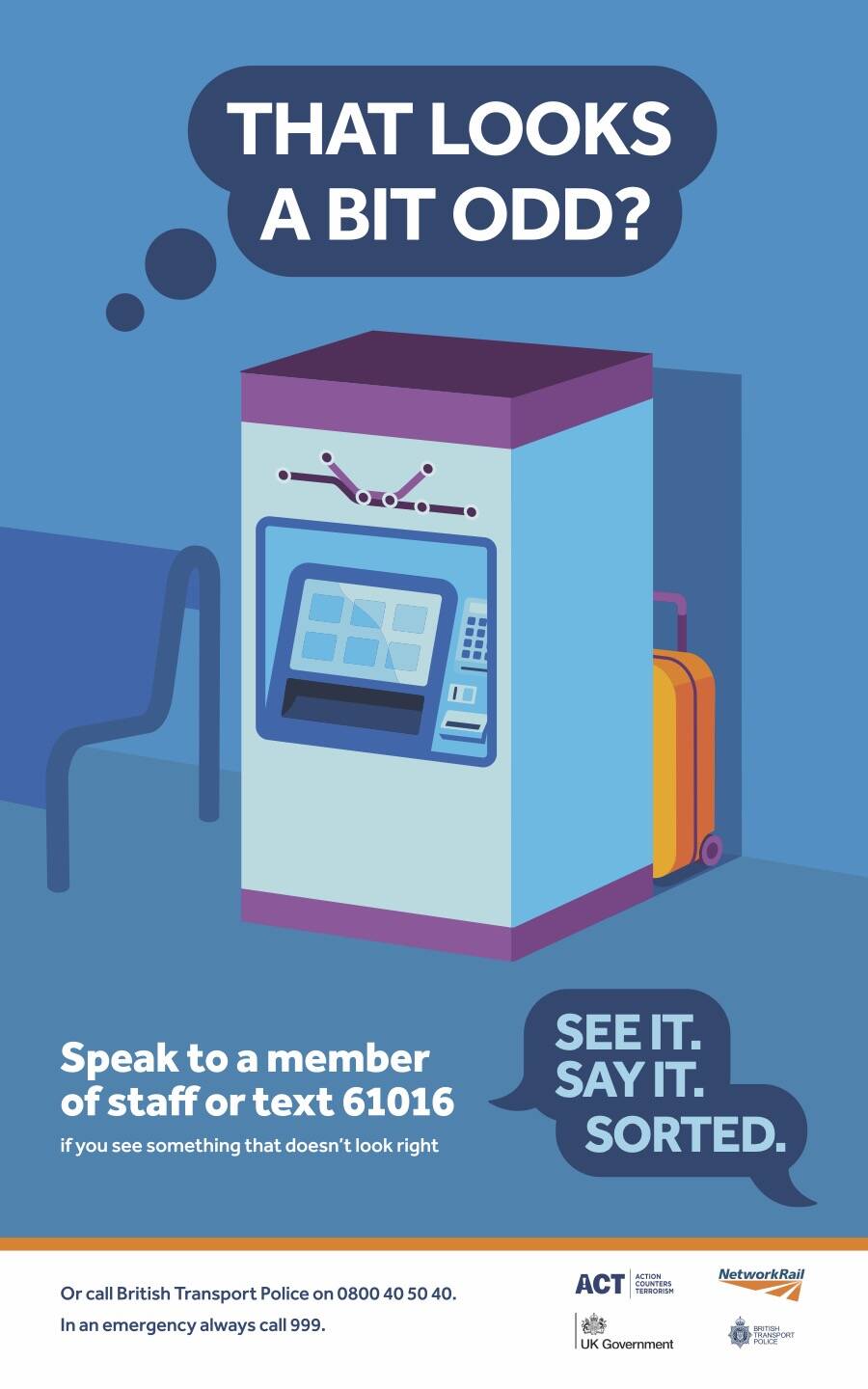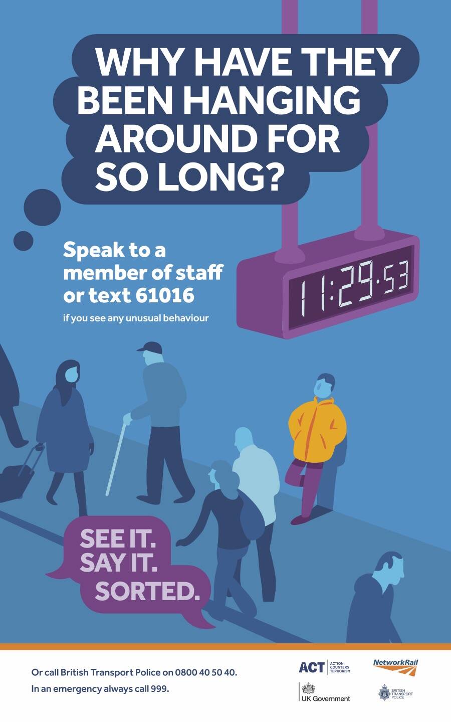 There are a lot of these revamped See It Say It Sorted adverts cropping up everywhere, a new blue-background series encouraging you to clock suspicious behaviour amongst your fellow passengers. The usual dodgy suitcase stuff (THAT LOOKS A BIT ODD), skulking doors (ARE THEY GOING SOMEWHERE THEY SHOULDN'T?) and lurking ne'erdowells (ARE THEY AVOIDING THE AUTHORITIES?). In this case the exhortation is to query WHY HAVE THEY BEEN HANGING AROUND FOR SO LONG?, something which could have a perfectly innocent explanation. I find it sad that they're suggesting alerting the authorities, especially when someone's hugely more likely to be waiting for something rather than an evil terrorist. Also if you've noticed that someone's been hanging around for a long time then you probably have too, so just turn yourself in and be done with it.