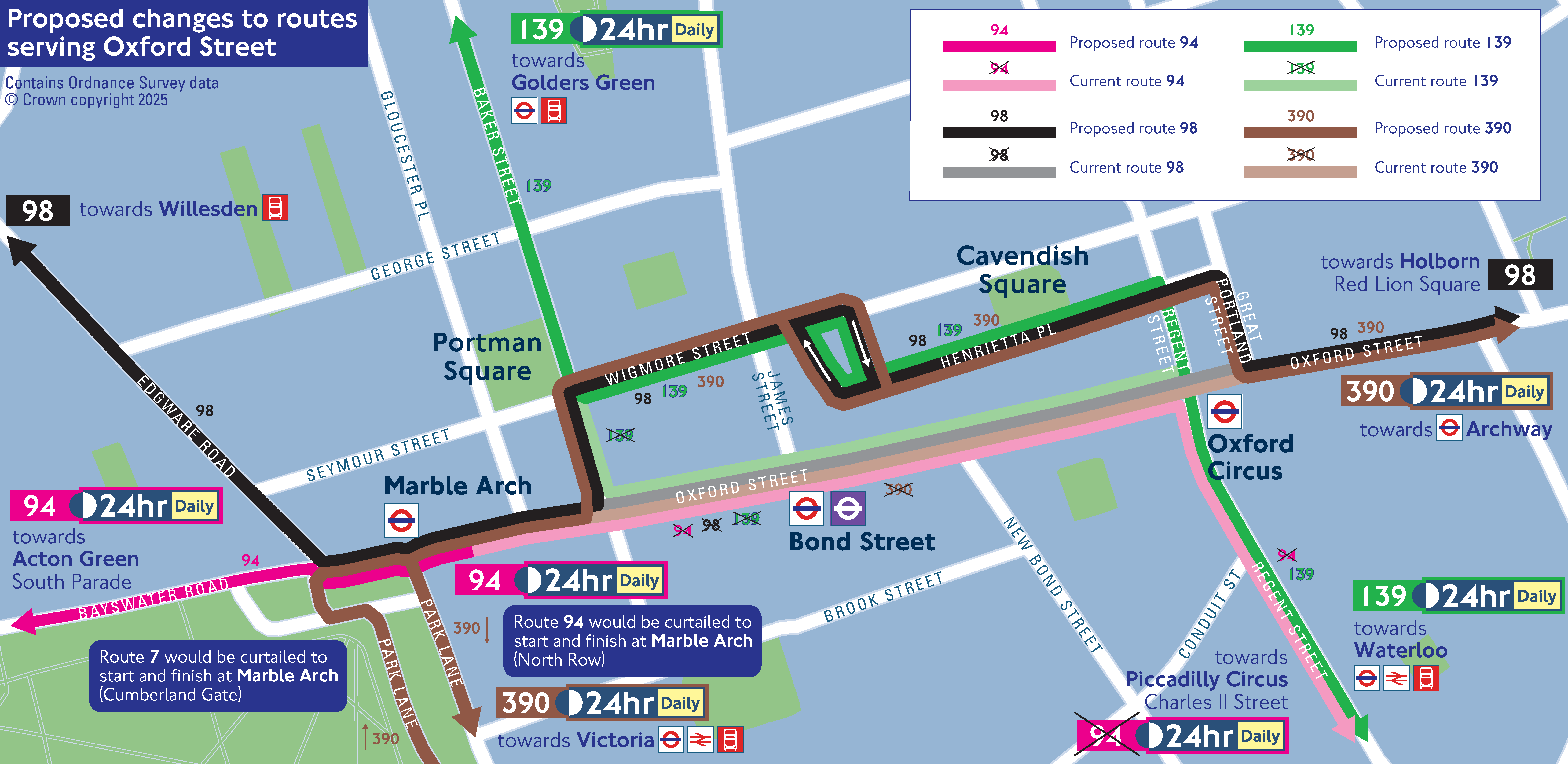 Originally the slimming down was because Oxford Street was deemed to be overbussed, with umpteen queueing double deckers getting in the way of shoppers. Later it felt more like zealotry, chopping off the ends of routes so they didn't have to go down Oxford Street at all. Now they're all disappearing, with three routes being sent along parallel streets (98, 139, 390) and two more getting their ends chopped off (7, 94).